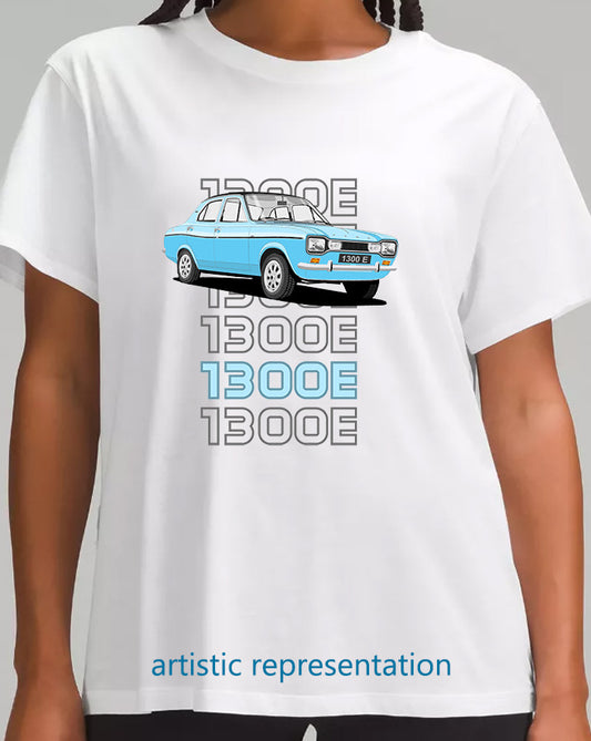 Ford Escort Mk1 1300E 4 Door in Light Blue Art T Shirt (Words)