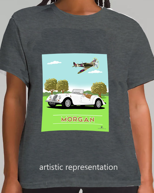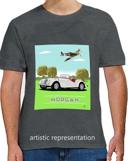 Morgan Plus 8 in White with Spitfire Art T Shirt